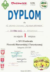 16 listopada 2019 r. na XVI Festiwalu Piosenki Harcerskiej i Turystycznej w Siennie zespół wokalny z 12 Gromady Zuchowej „Tęczowa Gromada” (działającej w naszej szkole od blisko dziesięciu lat) zdobył 1. miejsce. Zuchenki wykonały dwie piosenki: „Prawo zucha” i „To przygoda”. Gratulujemy!